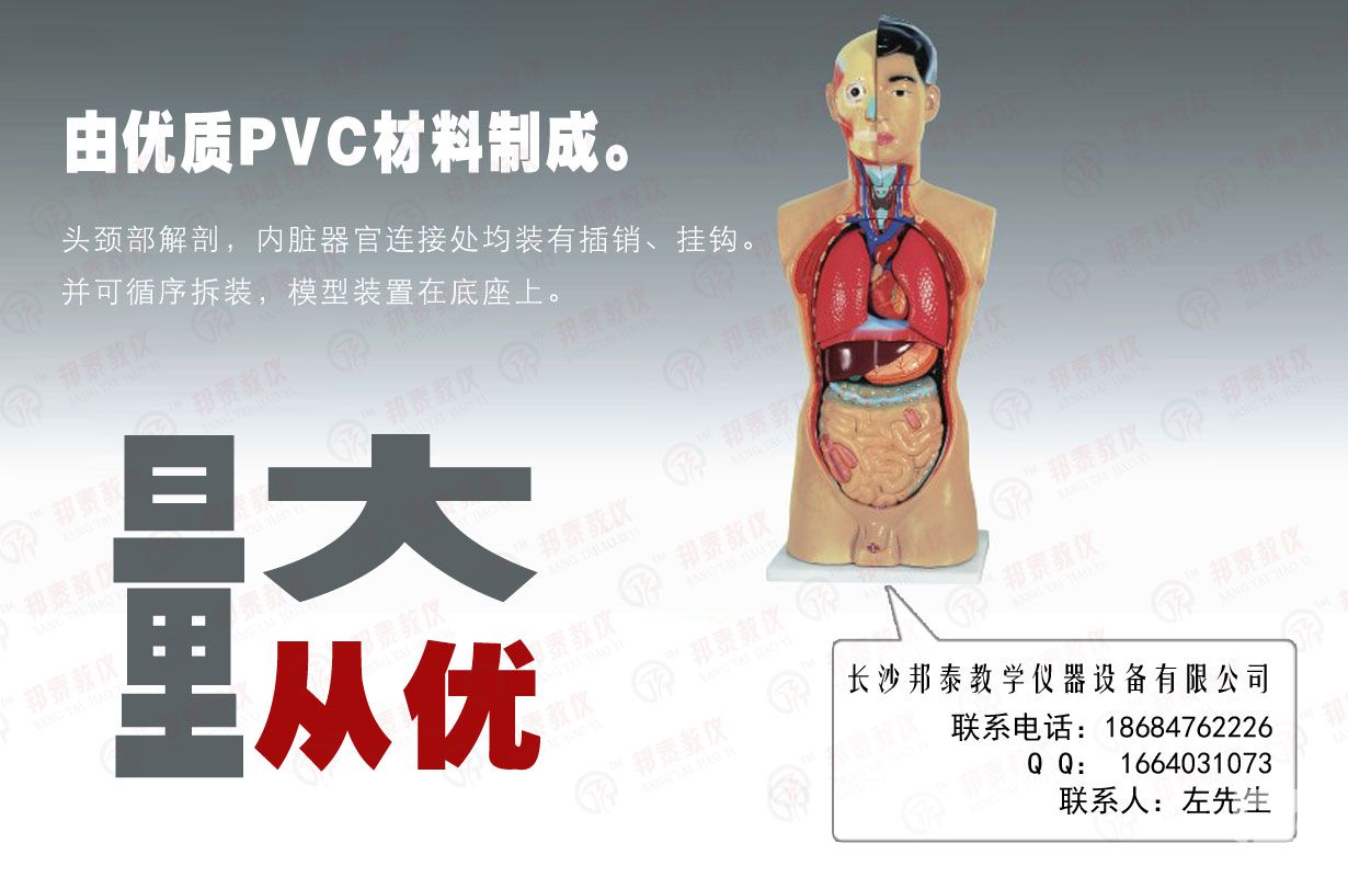 由優(yōu)質(zhì)PVC材料制成。頭頸部解剖,內(nèi)臟器官連接處均裝有插銷、掛鉤。并可循序拆裝,模型裝置在底座上。