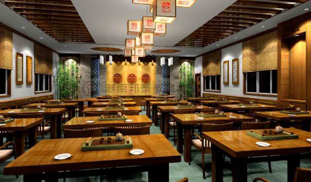 古風桌椅,配套的茶具整齊的擺放在桌子上,墻邊放置木質展覽架,墻壁上可掛有品茗壁畫與茶藝文房墨寶,調以暖色調的燈光,獨特的飲茶氛圍油然而生。